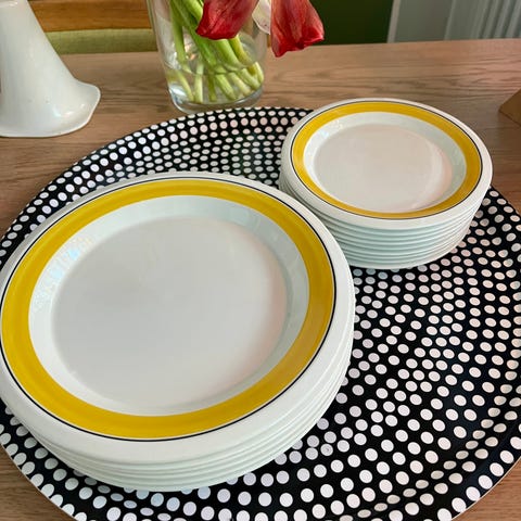 Keltainen Faenza 70-luvulta, hyväkuntoinen kuppipari, kuppi ja asetti + lautanen 17 cm. HP 25 eur/setti. Sokerikko tai kulho halkaisija n. 10,5 cm samaa sarjaa 12 eur. Kaikki ehjiä ja vähän kulumaa. Turun ja Helsingin seutu.