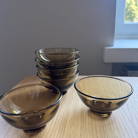 Nanny Still Riihimäen lasi 4 kpl jälkiruokakulhoja, väri ruskea. Hyvä kunto, ehjät ja virheettömät. Nouto Töölöstä. Hinta yhteensä 15 euroa.