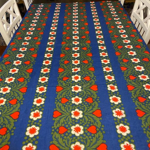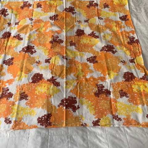 Tämä retro tekstiili on joskus toiminut päiväpeittona siistissä kodissa. On paksuhkoa puuvillaa. Jostain 50-luvulta. Pesun jäljiltä. Ehkä on verhoilukangas tms. Kuvio on ajalle tyypillistä. Uskoisin että on kotimaista tuotantoa. Koko n. 253 x 130 cm. Kankaassa pari kudontavirhettä, mutta aika huomaamattomia. Väri musta-valko-harmaa.
