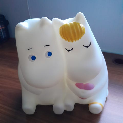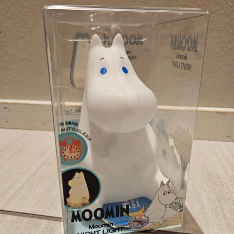 Uusi ja käyttämätön Pluto Produkter Muumi-yövalo. Kartonkia. Toisella puolen Muumipeikko, toisella Nuuskamuikkunen ja Pikku Myy.