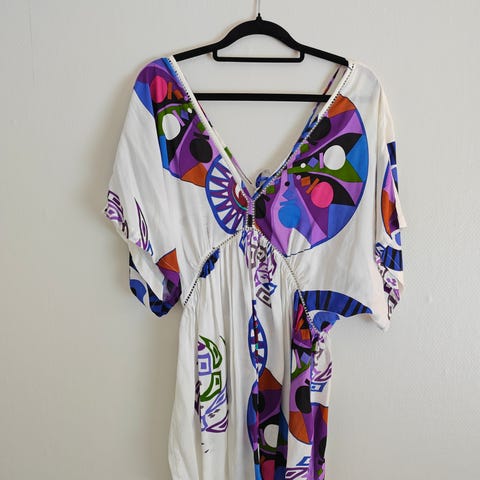 Kaunis Desigualin kesämekko; koko 34, mutta menee myös koolle 36. Siisti kunto. Kultalankaa purkautunut kuviosta, huomioitu hinnassa, ei haittaa käytössä.