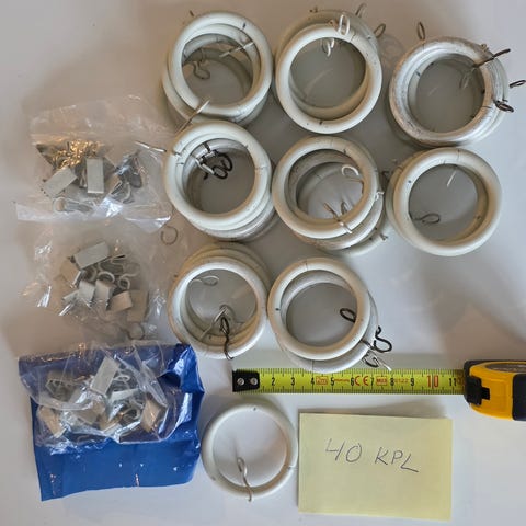 Tukevat metalliset verhon ripustamiseen soveltuvat renkaat, halkaisijaltaan 5 cm.