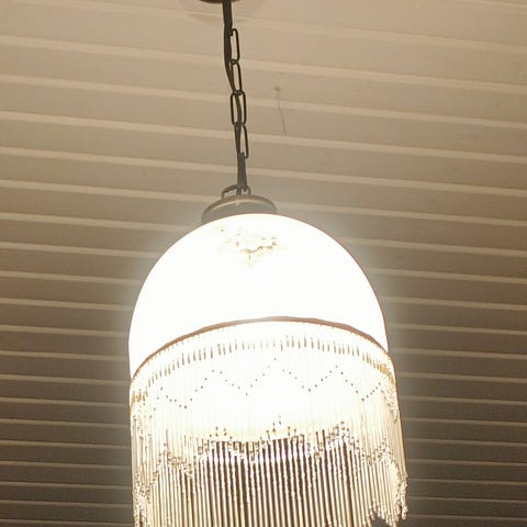Vanha, valkoiseksi maalattu koristeellinen kattolamppu. Alta pilkottaa paikoitellen pronssin väriä. Lehtikuvio, 6 lamppua. Ollut kiinnitettynä suoraan johdosta.