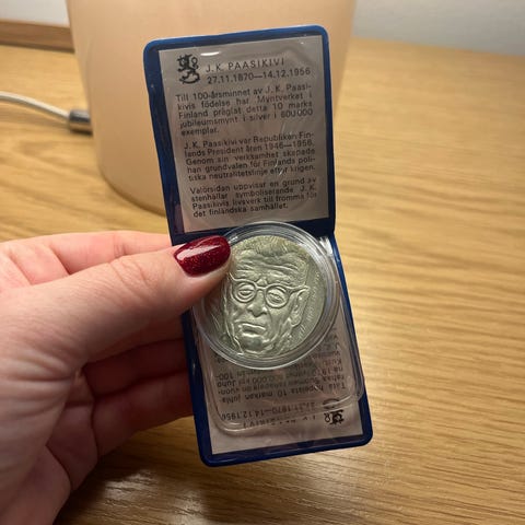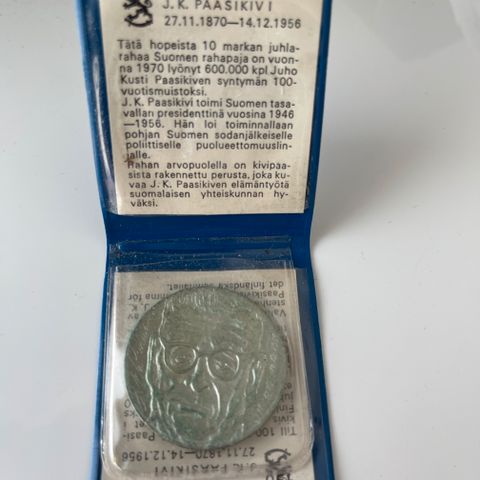 Markkoja ja hopeinen Paasikivi 10 markan juhlaraha.