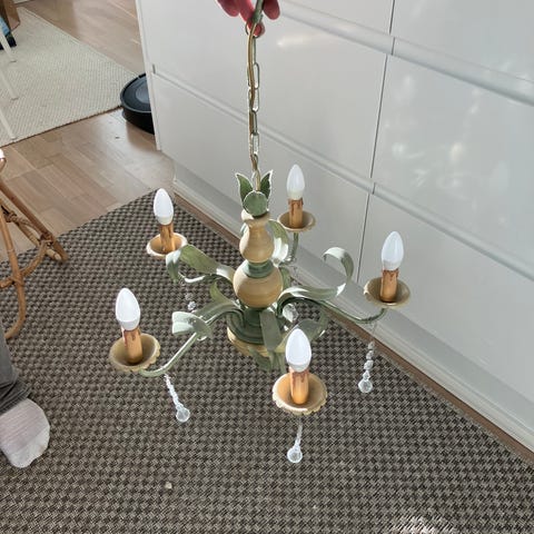 Retro kattovalaisin suoraan käytöstä, toimii. Puurunkoinen viisi lamppuinen kattovalaisin.
