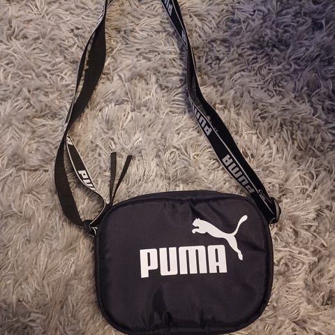 Puma:n olkalaukku. Materiaali kangas ja tekonahka. Hieman pussimainen. Vähän käytetty. Pinnan valkoisissa osissa kuitenkin hieman jo tummentumaa ja pari tahraa.