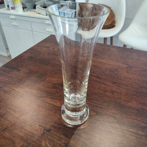Pyöreä lasimaljakko. Suuaukon halkaisija n. 15cm ja koko maljakon halkaisija 20-22cm