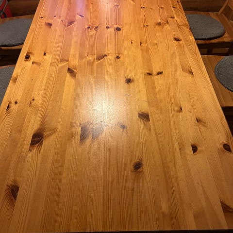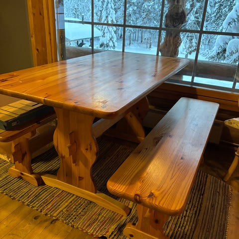 Uniikki kelohonkainen pirttikalusto. Sisältää pöydän ja kaksi pirtin penkkiä.