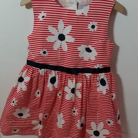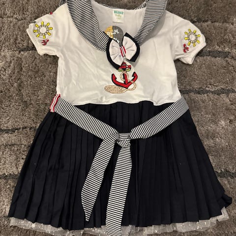 Myydään hyväkuntoinen lasten merimiesmekko. Koko 90. Mekko on 100% viskoosia.
