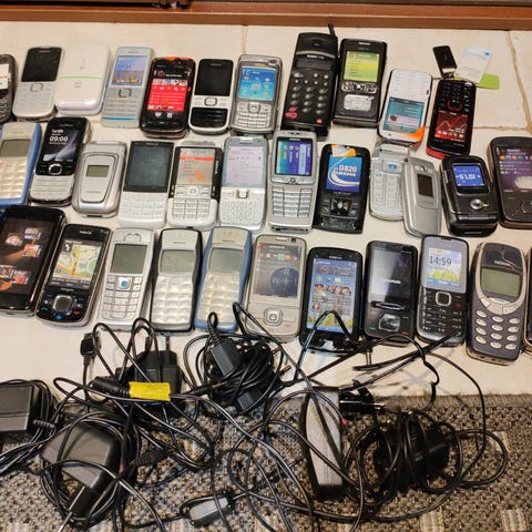 Neljä Nokian puhelinta ja yksi Eriksson (siis laatikon). Todennäköisesti akut loppu ja voi olla muutakin vikaa.