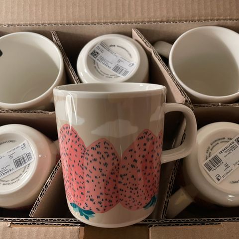 Uudet ja käyttämättömät Marimekon Oiva Mansikka aiheiset Mansikkavuoret lautanen 20cm, lautanen 13,5cm, muki 2,5dl, korvaton kuppi 2dl ja kulho 2,5dl.