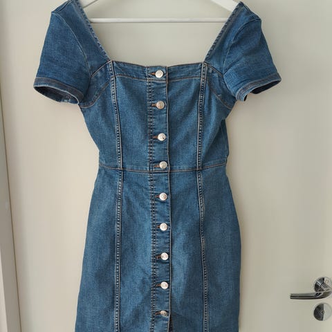 Hyvässä käytetyssä kunnossa oleva farkkumekko. Kokoa s. Väri on musta ja siinä on tumman harmaata yksityiskohtia (hiukan kulutetun näköinen pinta)