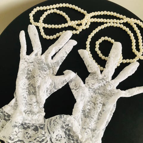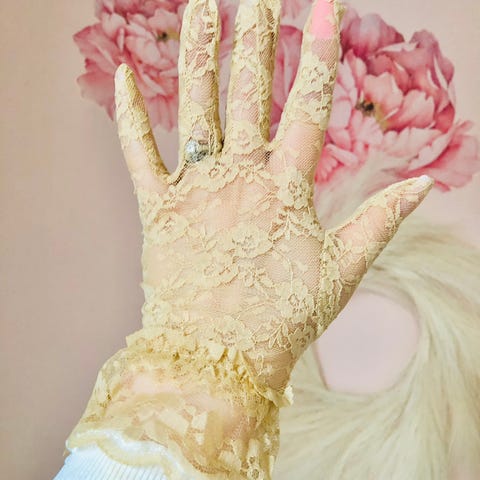 Valkoiset vintage pitsikäsineet. Kunto on todella hyvä, mutta hieman on tummumaa sormissa. Oletan, että käsineet on virkattu puuvillalangasta, joten nämä pitäisi pystyä tarvittaessa värjäämään.