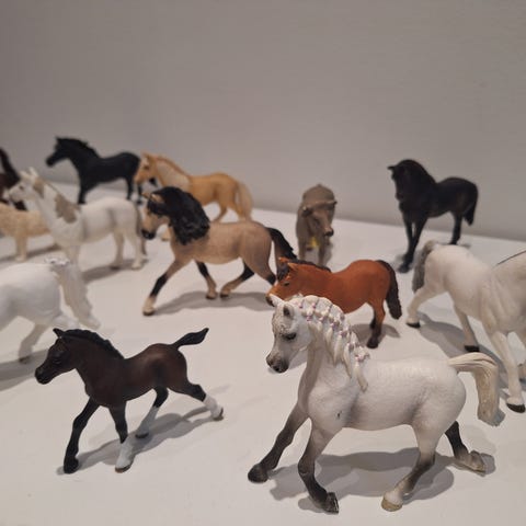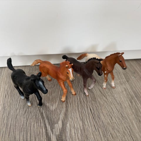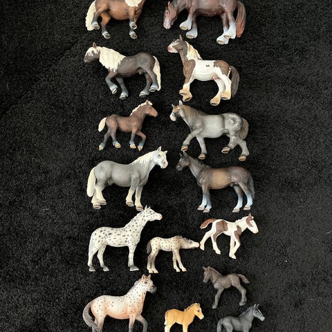 Myydään Schleich-eläimiä: yksi hevonen, kaksi varsaa, kaksi kissaa, pupu ja koira. Maalipinnassa vähän kulumaa, muuten hyvässä kunnossa. Hevonen 7 €, varsat 3 €/kpl, muut eläimet 2 €/kpl TAI kaikki yhteensä 15 €.