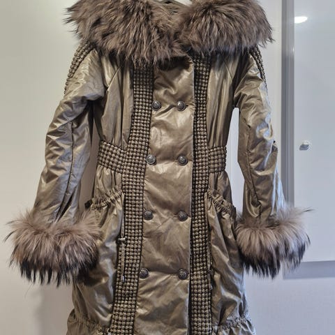Toppatakki joka muistuttaa kelsiturkkia. Iso huppu joka on irroitettavissa vetoketjulla. Merkki on Comma.