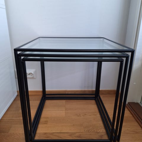Lasinen, musta runkoinen, kolmikulmainen sivupöytä - sarjapöytä.