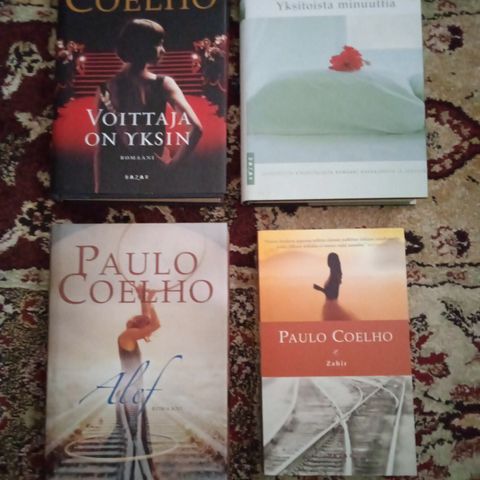 Myydään kuusi Paolo Coelhon kirjaa: Zahir, Uskottomuus,Vakooja, Brida, Pyhiinvaellus ja Yksitoista minuuttia. Yksittäishinta on 5 euroa/kirja. Jos ostaa kaikki hinta on 25 euroa.