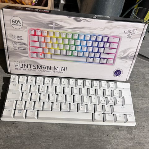 Uudenveroisessa kunnossa oleva Razer Huntsman Mini pelinäppäimistö violeteilla click switcheillä.