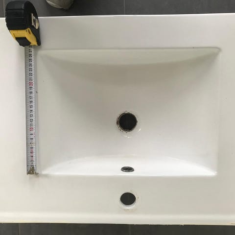 Uusi käyttämätön työtason päälle asennettava Keraaminen allas, missä valmiina hanan paikka.