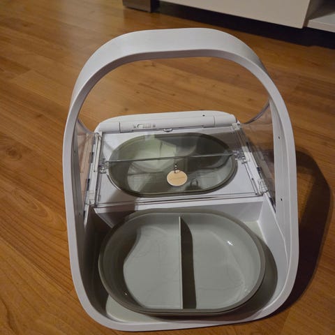 Automaattiin mahtuu 5 ruoka-annosta. Annokset annetaan kissalle ennalta ohjelmoituun kellonaikaan 1-5krt vuorokaudessa. Ruokien alle voi laittaa jäädytettävän kylmäpatruunan, joka on ollut tosi hyvä raaka- ja märkäruokien kanssa. Samaa laitetta myydään myös nimellä Cat Mate C500 jos haluaa googlata ominaisuuksia.