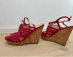 Fuksia osa mokkanahkaa. Korko-osa korkkia (?) tai ainakin näköistä. Vähän pehmeää.