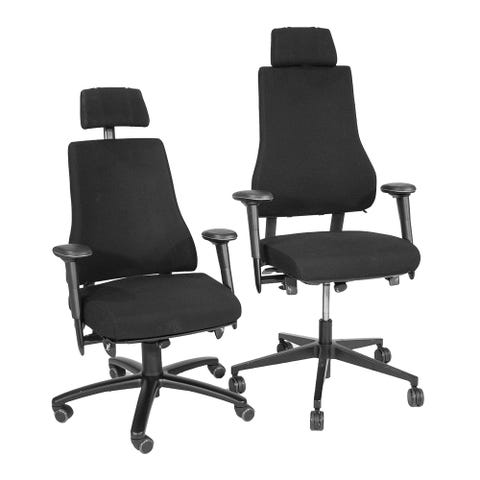 Hyväkuntoinen myymälämalli. Työtuoli verhoiltu laadukkaalla mustalla Estoril-nahalla. Musta jalka, kaasujousella korkeussäädettävä.