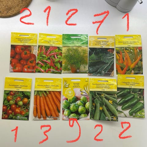 Siemenet- Seeds. Persilja, juuret, kukat, herne, kurkku