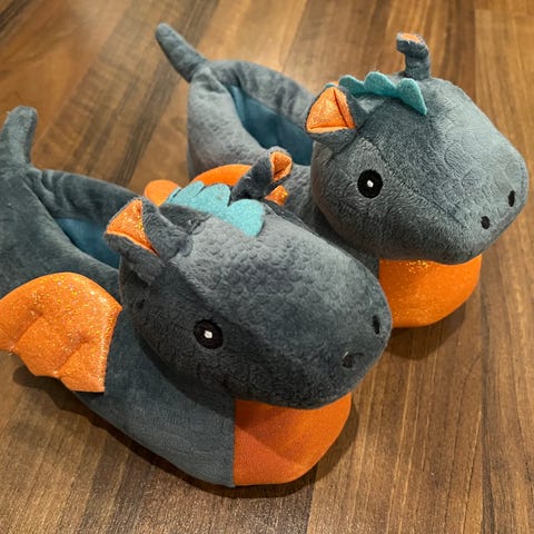 Myydään pehmoiset lasten hirviö / lohikäärme / krokotiili -tossut kokonumerolla 34-36. Tohvelit ovat paksut ja pörröiset. Myös pohja on pehmeä. Ehjät.