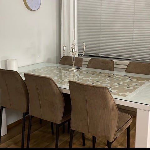 Pohjanmaan hyväkuntoinen ruokailuryhmä, kuin uusi. Lisäksi lasilevy pöydälle joka ei ole kuvassa. 300e/tarjoa