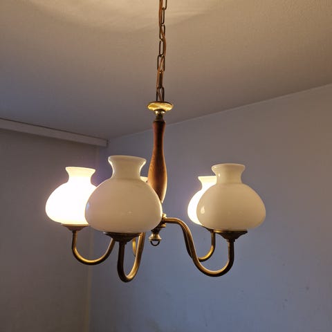 Sailytyksessä pölyttynyt kattolamppu. Yksi uloke hieman taittunut mutta saa varmaan suoristettua. Muuten ulkoisesti ainakin ehjä. Toimi ainakin silloin kun viimeksi oli käytössä.