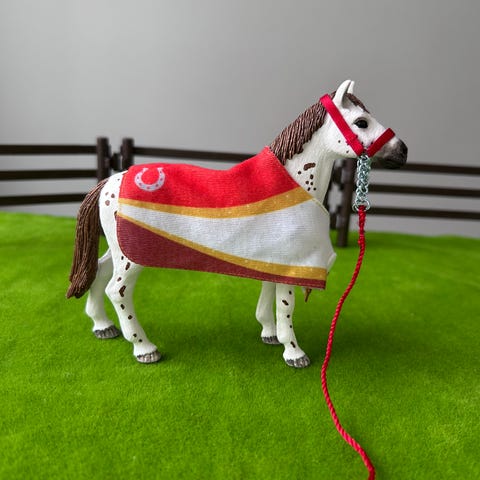 Tyttäreni myy itse tekemänsä loimen ja riimun. Sopivat Schleich-poneille. Hevonen ei siis ole myytävänä, ainoastaan mallina.