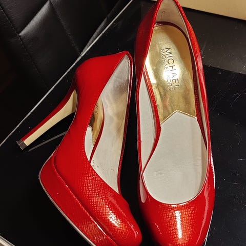 Elegantit Michael Korsin teräväkärkiset piikkikorkokengät, joiden materiaali on pehmeää nahkaa. Koron korkeus 8,5 cm. Pohja miellyttävän joustava ja ei ole liukas. Tyylikkään yksinkertaisissa avokkaissa yksityiskohtana kullan värinen MK-merkki kengän takana.