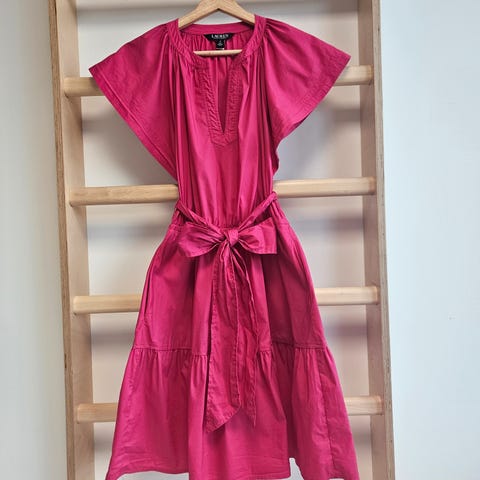 Ralph Lauren punainen polvimittainen samettimekko venepääntiellä. Kokomerkintä 4 joka vastaa pientä XS-kokoa. Mekon malli on Lendiva, googlettamalla löytyy lisäkuvia istuvuudesta, tätä on vaikea kuvata henkarissa.