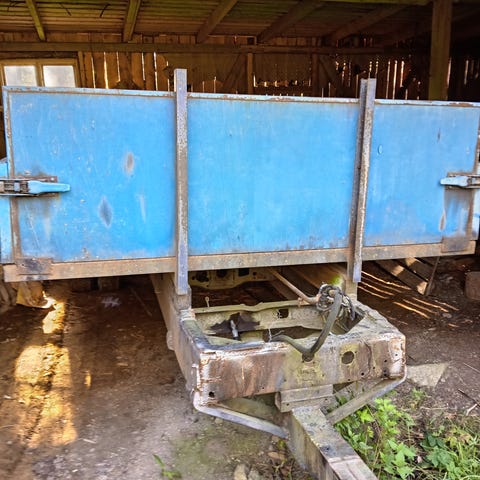 Traktorin kippikärry telillä ja automaattisesti avautuvalla takalaidalla. Pohja terästä. Sivut sinkittyä terästä ja sisällä vaneri. Siisti ja hyväkuntoinen.