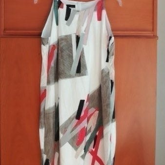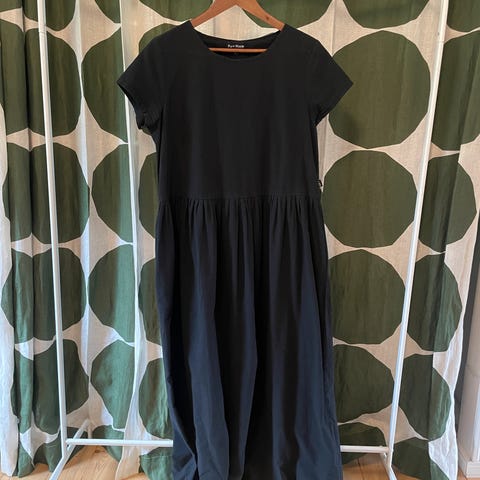 Noisy May -merkkinen musta puuvillainen perusmekko, jonka sisään voi "piiloutua". Pituus noin puolireiteen. Vyötäröltä leveä, ei kiristä mistään. Koko M, mutta niin reilunoloinen, että tuntuu L-koolta. 95% orgaanista puuvillaa, 5%elastaania.