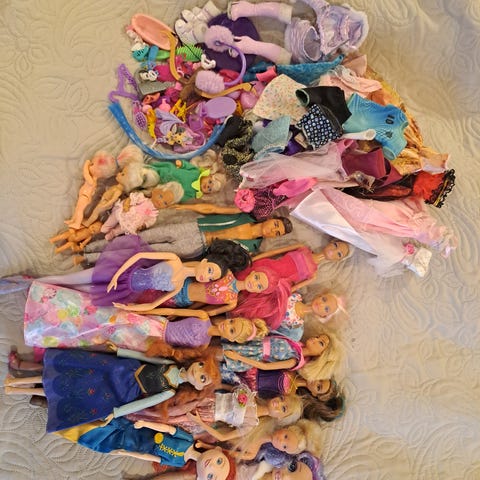 Paketissa sekä aikuis- että lapsinukkeja, yksi vauva ja koira. Iso laatikollinen vaatteita, asusteita ja kenkiä.