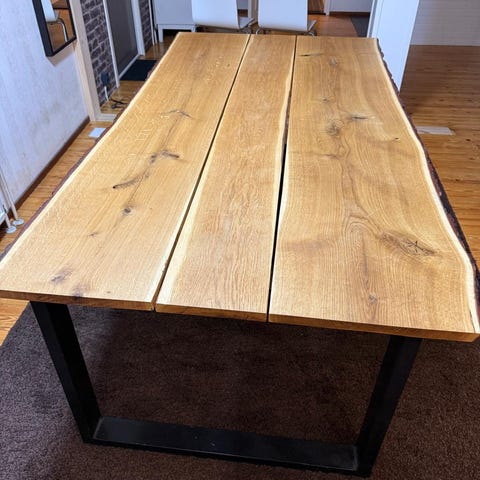 Itsetehty lankkupöytä ja penkki (2022). Lankut haapaa, Kimolan puulta. Vanhan singerin jalat ja lisätty vielä tukiraudat, on siis kestävä mutta helposti purettava. Penkin jalat tilattu.