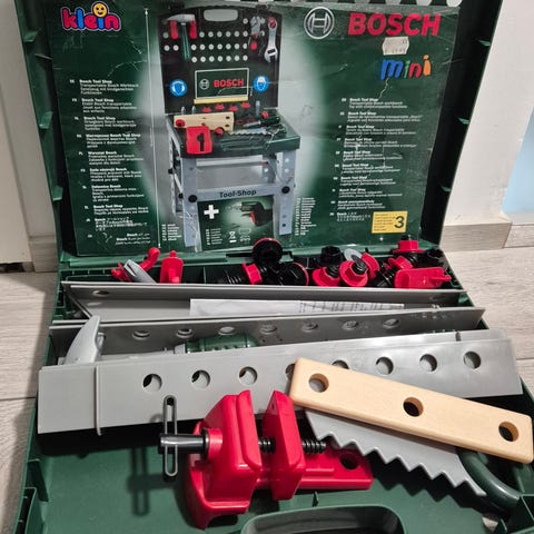 Bosch leikki työkalupenkki jne. Kuvan mukaiset lelut vaikka leikkimökkiin. Melko hyvässä kunnnossa, toki on ollut leikkimökissä.