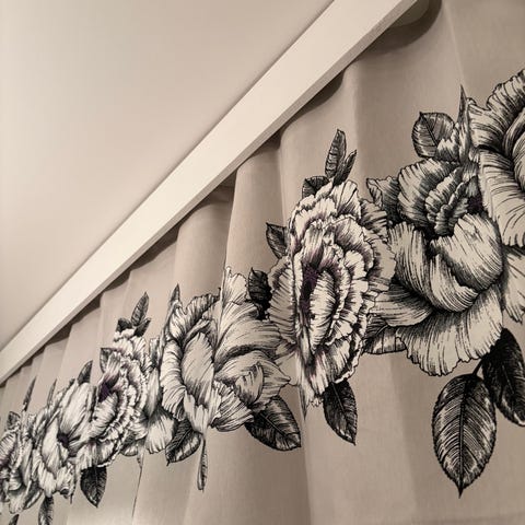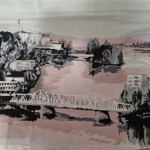 Vallilan vanhakaupunkikuvioinen kappaverho 115 cm x 57 cm pieneen ikkunaan. Ripustus onnistuu niin verhonipsuilla kuin tankokujalla. Eläimetön ja savuton koti.