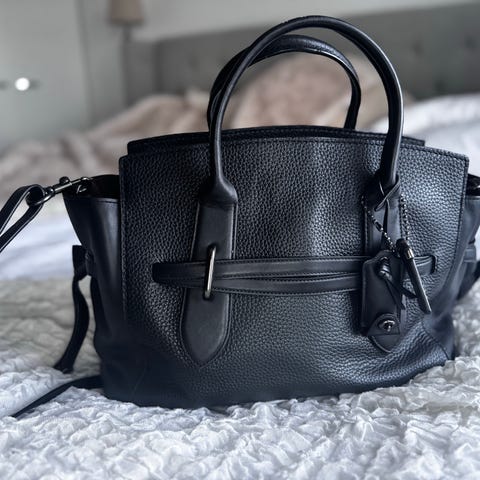 Keräilyharvinaisuus: Rogue 31 mallistosta 1941, klassisessa Coach Saddle -ruskeassa värissä, upealla viininpunaisella mokkavuorilla. Laukku on valmistettu rakeisesta nahasta (pebble leather) ja siinä on keltaiset kontrastiompeleet sekä tummanpuhuvat gunmetal-metalliosat.