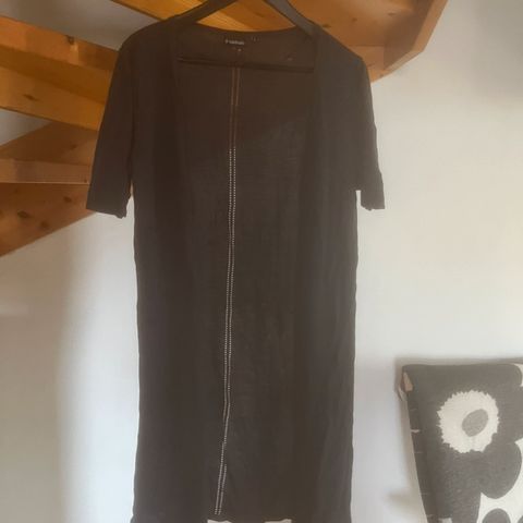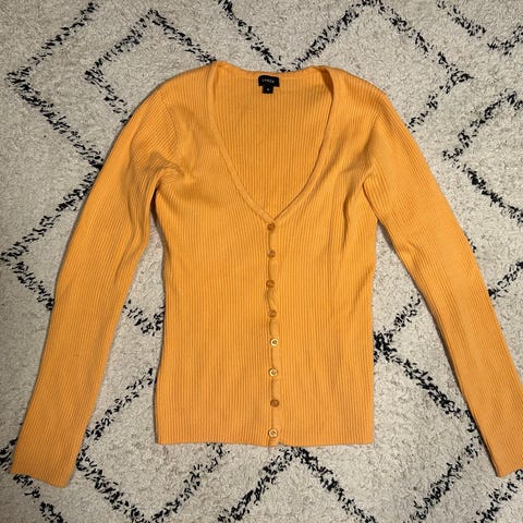 Long, sparkly orange cardigan with stripes. Looks nice with an elegant dress, over a swimsuit, or more casual.