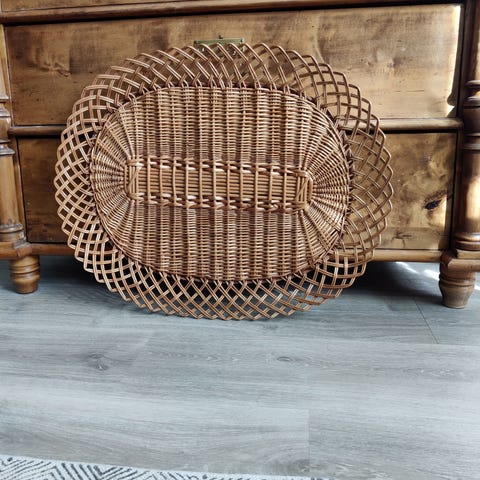 Ethän tingi kiitos. Upea kaunis 50cm halkaisijaltaan, reunan korkeus noin 13cm, oleva rottinki kori tarjoiluvati tarjoilu astia. Hyvä lankakori tai lemmikin peti, lisää vain tyyny. Loistava kunto, ei käytön jälkiä. Näitä on kaksi.