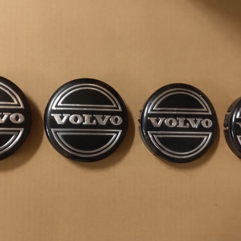 Neljä kappaletta uusia Volvo vannemerkkejä.