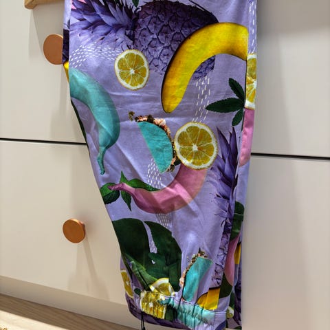 Myydään Uhana design -housut vuoden 2018 mallistosta. Pientä pesuhaitua pinnassa eivätkä värit enää aivan yhtä kirkkaat kuin uutena. Lahkeen sisäpituus 68 cm, vyötärö 67 cm. Materiaalitiedot kuvissa. Ei kovin paksua kangasta, vertautuu paitapuserokankaaseen.