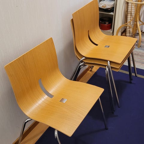 Istuimet valkoista muovia – jalat kromattua metallia