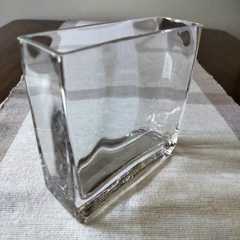 Kaunis iso lasimaljakko koristeellisessa metallikehikossa. Kaikin puolin ehjä ja naarmuton. Varsin painava. Korkeus 27 cm, suuaukko 14x10 cm