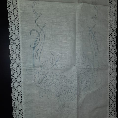 Valkoinen , pellavaa ja puuvillaa. Kirjottava pöytäliina. Kuvio koko liinassa. Koko 40x40cm. Reunat huoliteltu.