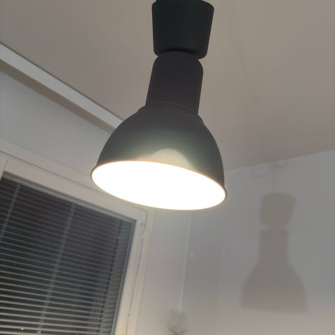 Kaunis ja veikeä punainen riippuvalaisin. Materiaali tukevaa metallia, mattapinta. Kattokupu on muovia. Pitkä johto, sähköpistoke. Pinnassa joitakin naarmuja, jotka näkyvät vain läheltä eivätkä haittaa käyttöä.