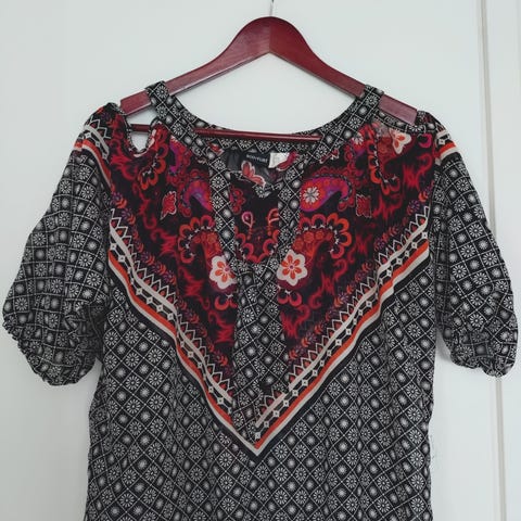 Kiva paita, jonka tausta ohutta collegekangasta ja etupuoli viskoosia.