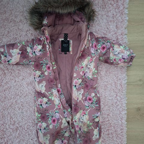 Kaunis laivastonsininen, ruusukuvioinen, talvipuku (Name it, koko 86, 1-2v.). Irrotettava huppu tekoturkiksella. Pieniä heijastinviivoja hihoissa, hupussa ja selässä. Jonkin verran kestää sadetta. Kevyttä kulumaa polvissa, takapuolessa, hihansuissa.